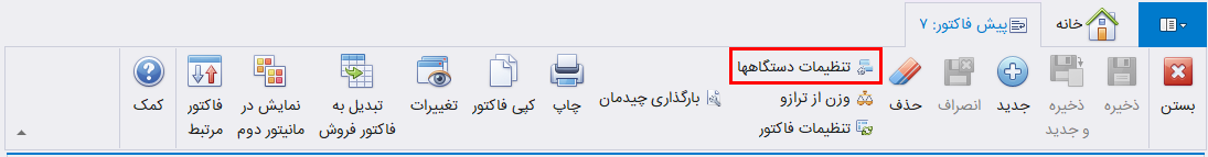 با استفاده از دکمه تنظیمات دستگاهها میتوانید، تنظیمات مرتبط به دستگاه کارت خوان بانکی (POS) و ترازو را انجام دهید.
