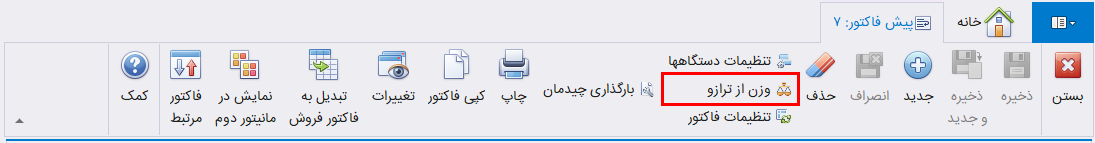 در نرم افزار حسابگر شعب میتوانید مقدار ردیف پیش فاکتور صادر شده را از طریق ترازو متصل به برنامه حسابگر شعب وارد کنید. برای این کار بعد از انتخاب کالا، ستون تعداد را انتخاب کرده و دکمه وزن از ترازو را فشار دهید.