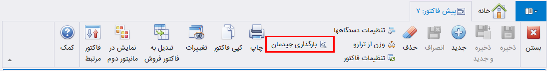 با استفاده از امکان بارگذاری چیدمان میتوانید نمایههای قرار داده شده را برای پیش فاکتور انتخاب کنید. از این نمایهها جهت سهولت و تسریع کار در شعب پر فروش استفاده میشود.
