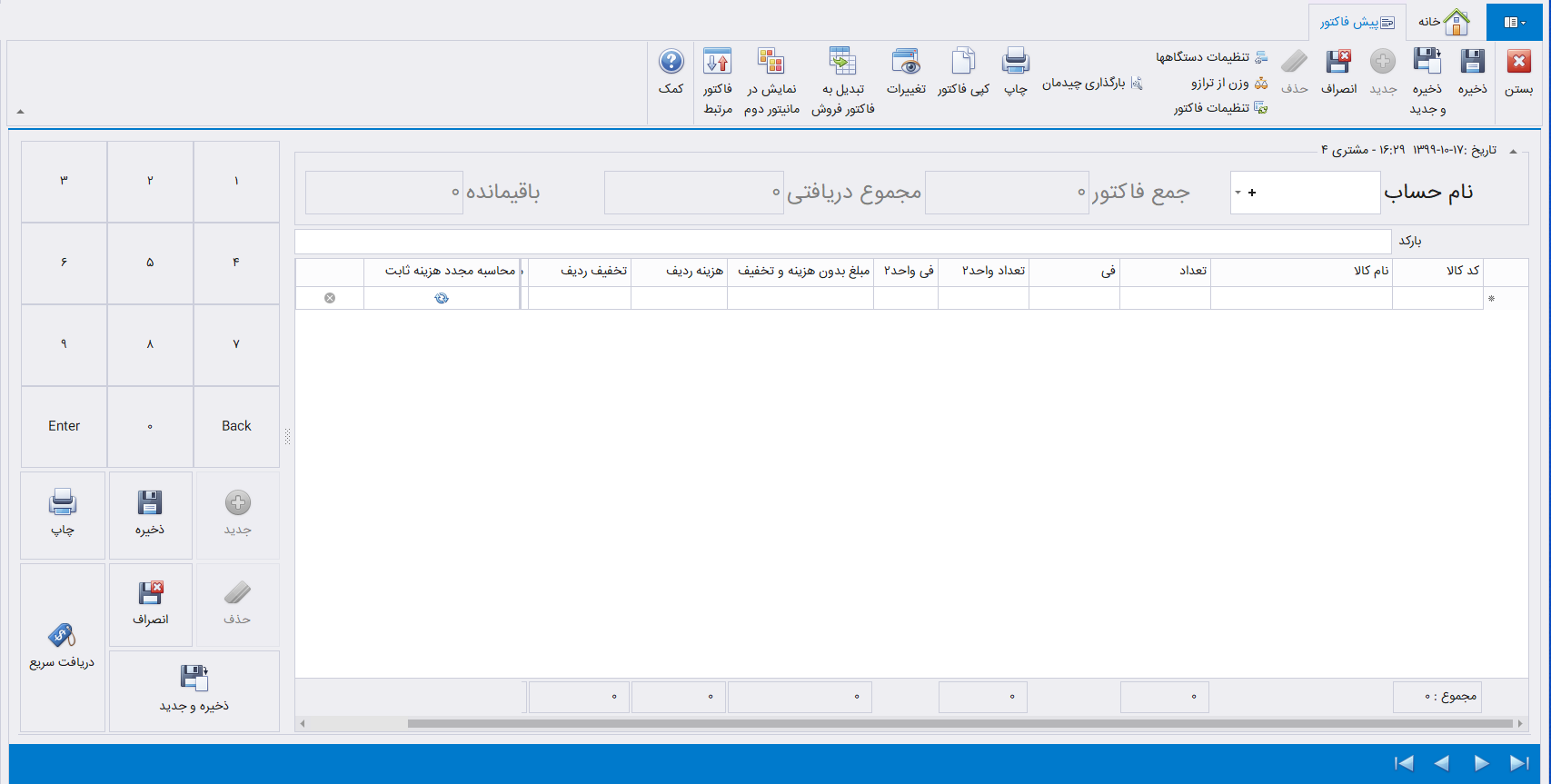 چنانچه از سیستمهای دو مانیتور استفاده میکنید و بخواهید اطلاعات وارد شده در فاکتور، در مانیتور دوم هم نمایش داده شوند، بر روی دکمه مانیتور دوم کلیک کنید.