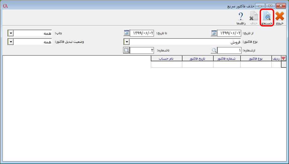 بعد از تعیین موارد مورد نظر جهت نمایش فاکتورهای انتخابی بر روی دکمه جستجو کلیک کنید تا لیست فاکتورهای انتخابی در جدول فرم نمایش داده شوند.