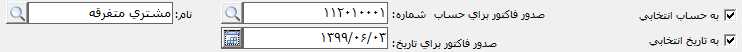 برای تعیین طرف حسابی که میخواهید فاکتور فروش به نام آن صادر شود، پارامتر "به حساب انتخابی" را فعال سپس در قسمت "صدور فاکتور برای حساب شماره"، طرف حساب مورد نظر را از لیست حسابها انتخاب کنید همچنین برای تعیین تاریخ انتخابی، پارامتر "به تاريخ انتخابی" را فعال و در قسمت "صدور فاكتور برای تاريخ"، تاريخ فاكتور را انتخاب نمایید.