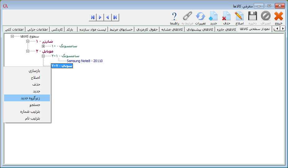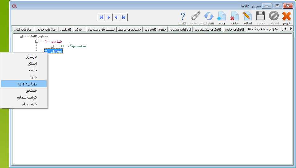 بعد از تعریف زیر گروه کالا، برای تعریف کالا ابتدا زیر گروه مورد نظر را در حالت انتخاب قرار دهید سپس بر روی آن کلیک راست کنید و گزینه "زیر گروه جدید" را انتخاب کنيد.