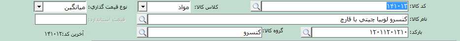 در قسمت کد، کد کالا و در قسمت نام کالا، نام کالا مورد نظر را وارد کنید. در قسمت کلاس کالا، نوع کلاس كالا را از لیست کشویی انتخاب کنید. در حسابگر کلاس کالا به طور پيش فرض مواد میباشد. کلاس کالا محصول برای کالاهايی به کار میرود که طی مراحل توليد، توليد میشوند و کلاس محصول تجزيه برای کالاهايی به کار میرويد که طی مراحل تجزيه ايجاد میشوند. در قسمت نوع قيمت گذاری کالا، روش محاسبه قيمت کالا را مشخص کنید. در حسابگر نحوه قیمت گذاری کالا به 3 روش میانگین، استاندارد و FIFO وجود دارد. چنانچه برای کالاها از بارکد استفاده میکنيد، در قسمت بارکد، بارکد کالا را وارد کنید. در قسمت گروه کالا، گروه بالاتر مرتبط به اين کالا را مشخص کنيد.