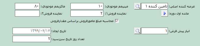 در قسمت مينيمم و ماکزیمم موجودی، می توانید نقطه سفارش کالا را مشخص کنيد. به این صورت که اگر در زمان صدور فاکتور، مانده موجودی کالا از مقدار وارد شده در قسمت مینمم کمتر شد یا از مقدار وارد شده در قسمت ماکزیمم بیشتر شد، پيغام داده شود. برای تعیین پارامتر مربوط به این قسمت از مسیر شرايط محيطی > پارامترهای خريد و فروش، پارامتر شماره 9 و 10 قابل تنظيم است. در قسمت مانده اول دوره میتوانید مقدار و مبلغ مانده اول دوره کالا را با کلیک بر روی دکمه مربوط به این قسمت وارد نماييد.