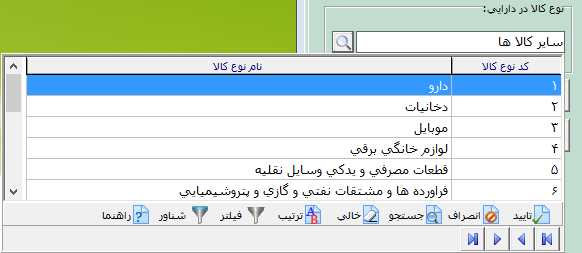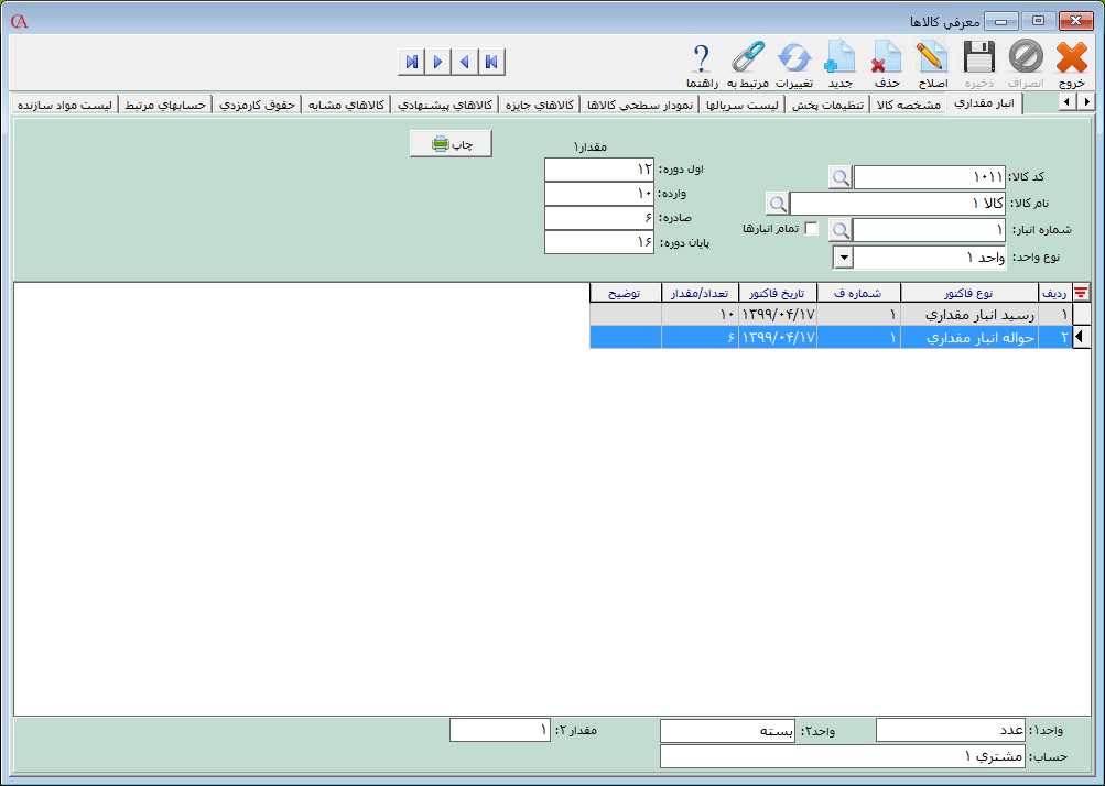 بعد از تعیین موارد مورد نظر بر روی دکمه ذخیره کلیک کنید. برای حذف کالای تعریف شده بر روی دکمه حذف و برای اصلاح اطلاعات وارد شده بر روی دکمه اصلاح کلیک کنید. توجه داشته باشید که در صورتی میتوانید کالا را حذف نمایید که در برنامه هيچگونه وابستگی به اين کالا وجود نداشته باشد. به عنوان مثال اين کالا نبايد دارای گردش باشد يا به عنوان مواد اوليه برای يک محصول معرفی شده باشد.
