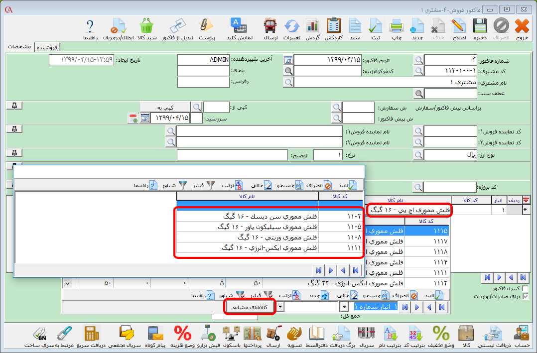 بعد از تعیین کالاهای مشابه، در هنگام صدور فاکتور بعد از انتخاب کالا، با استفاده از دکمه "کالاهای مشابه" میتوانید لیست کالاهای مشابه تعریف شده برای کالا را مشاهده و در صورت نیاز انتخاب کنید.