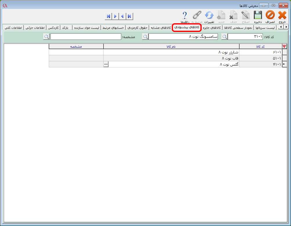 کالاهای پیشنهادی در نرم افزار حسابگر این امکان وجود دارد که بعد از صدور ردیف فاکتور، لیست کالاهای پیشنهادی نمایش داده شود. به عنوان مثال فرض کنید کالایی به نام موبایل سامسونگ نوت 8 دارید و میخواهید در صورتی که مشتری این کالا را انتخاب کرد، لیست کالاهای پیشنهادی (مثلا لوازم جانبی) نمایش داده شود تا آنها را به مشتری معرفی کنید. برای معرفی کالاهای پیشنهادی زبانه کالاهای پیشنهادی را انتخاب کنید. در قسمت کد و نام کالا، کالای مورد نظر را انتخاب کنید سپس در جدول برای تعریف کالای پیشنهادی جدید، یک سطر جدید ایجاد کنید. در ستون کد یا نام کالا، کالاهای مورد نظر را از لیست کالاها انتخاب کنید. بعد از تعیین کالاهای پیشنهادی بر روی دکمه ذخیره کلیک کنید. برای فعال کردن این امکان در هنگام صدور ردیف فاکتور از مسیر شرایط محیطی > پارامترهای خرید و فروش، تیک پارامتر شماره 33 را فعال کنید.