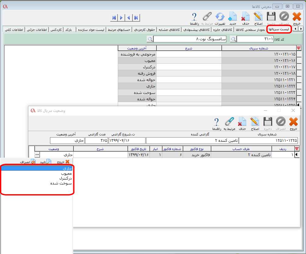 نکته: چنانچه از نرم افزار حسابگر نسخه 10 یا حسابگر ویژه پخش نسخه 9 به بالا استفاده میکنید، امکان معرفی کالا با سطوح نامحدود وجود دارد. به این معنا که میتوانید به تعداد نامحدود سرگروه کالا به صورت تو در تو تعریف کنید. جهت آشنایی با نحوه معرفی گروه بندی کالا در نرم افزار حسابگر میتوانید مقاله معرفی گروه کالا را مطالعه نمایید. لیست سریالها در نرم افزار حسابگر میتوانید برای کالاها شماره سریال مشخص نمایید. یعنی برای هر واحد کالا یک شماره اختصاص دهید. جهت آشنایی با امکان سریال و گارانتی کالا میتوانید مقاله آموزشی مربوط به آن را مشاهده فرمایید. در زبانه لیست سریالها بعد از انتخاب کالا میتوانید لیست سریالهای اختصاص داده شده به کالا را مشاهده نمایید. هر سریال میتواند دارای وضعیتهای «جاری»، «حواله شده»، «در کنترل»، «سوخت شده»، «فروش رفته»، «مرجوعی به فروشنده» و «معیوب» باشد که در ادامه هر مورد به تفصیل توضیح داده میشود. وضعیت «جاری»: سریال خریداری شده و آماده فروش است. وضعیت «حواله شده»: برای کالا حواله انبار صادر شده است. وضعیت «فروش رفته»: سریال فروخته شده و از انبار خارج شده است. وضعیت «در کنترل»: سریال فروخته شده مرجوع شود و مشخص نباشد که کالا سالم است یا نه. وضعیت «معیوب»: کالا دارای اشکال میباشد. وضعیت «سوخت شده»: کالا با آن سریال وجود دارد ولی قابل استفاده نیست. وضعیت «مرجوعی به فروشنده»: کالا به فروشنده اصلی برگشت شده است. برای تغییر وضعیت سریال کالاها در لیست سریالها بر روی "آخرین وضعیت سریال" سطر مورد نظر دابل کلیک کنید. در فرم باز شده بر روی دکمه قرار داده شده در ستون "وضعیت" کلیک کنید و وضعیت مورد نظر را انتخاب کنید سپس بر روی دکمه ذخیره کلیک کنید.