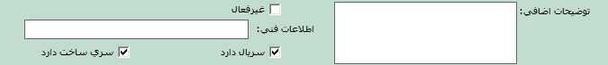 در قسمت توضيحات اضافی و اطلاعات فنی میتوانيد اطلاعات تکميلی مربوط به کالا را وارد نماييد. چنانچه بخواهید کالا در لیست اقلام موجودی نمايش داده نشود پارامتر "غير فعال" را فعال کنيد. توجه داشته باشید که کالای در حالت غیر فعال، در گزارشات نمایش داده میشود. در صورتی که بخواهید برای کالا، سريال تعریف کنید پارامتر "سريال دارد" و در صورتی که بخواهید برای کالا سری ساخت تعریف کنید، پارامتر "سری ساخت دارد" را فعال کنيد.