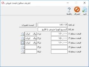 در قسمت قيمت فروش میتوانید 5 سطح قيمت با ارزهای مختلف برای کالا وارد کنید. برای وارد کردن سطح قسمت مربوط به کالا بر روی دکمه ذرهبین کلیک کنید.