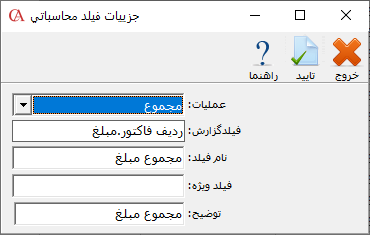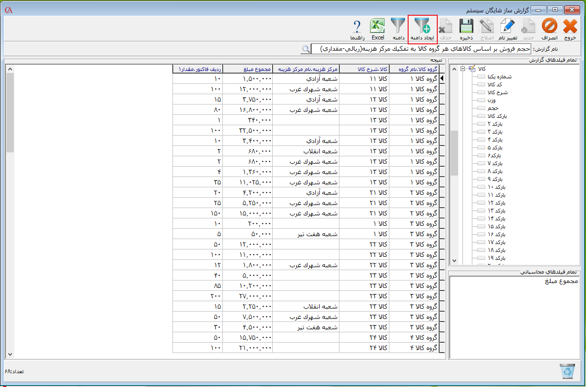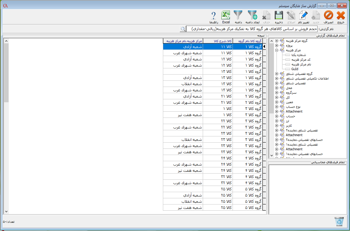 گزارش ساز شرکت شایگان سیستم برخلاف گزارش‌ساز Fast Report و گزارش ساز Quick Report که محدود به استفاده از فیلدهای تعیین‌شده برای آن گزارش بودید، در اینجا می‌توانید به دامنه گسترده‌ای از فیلدها دسترسی داشته باشید. گزارشات این بخش در دو دسته «بر اساس فاکتورها» و «بر اساس سندها» قابل طراحی است که در قسمت بر اساس فاکتور می‌توان گزارش را بر اساس اطلاعات فاکتورها و در قسمت بر اساس سندها براساس اطلاعات اسناد ایجاد نمود. برای ایجاد گزارش جدید از منو گزارشات > گزارش‌ساز شایگان سیستم > دسته بندی مورد نظر (گزارش بر اساس فاکتورها یا سندها) را انتخاب کنید. به عنوان مثال چنانچه بخواهید گزارش حجم فروش بر اساس کالاهای هر گروه کالا به تفکیک مرکز هزینه را به صورت ریالی و تعدادی ایجاد کنید، در این بخش گزارش بر اساس فاکتورها را انتخاب کنید. در ادامه این مقاله آموزشی نحوه ایجاد گزارش با استفاده از گزارش ساز شرکت شایگان سیستم توضیح داده می‌شود. در فرم باز شده برای معرفی گزارش جدید، بر روی دکمه جدید کلیک کنید. ایجاد گزارش با استفاده از گزارش ساز در حسابگر در فرم باز شده نام گزارش مورد نظر را وارد سپس بر روی دکمه تایید کلیک کنید. در نمودار سطحی سمت راست فرم گزارش ساز، فیلدهایی که می‌توانید برای ایجاد گزارش استفاده کنید، قرار دارند. برای اضافه کردن فیلد مورد نظر به گزارش آن را انتخاب سپس با عمل «کشیدن و رها کردن» به قسمت نتیجه گزارش، اضافه کنید. چنانچه در هنگام طراحی نیاز به فیلد محاسباتی باشد در این صورت، فیلد مورد نظر را با عمل کشیدن و رها کردن به قسمت فیلد محاسباتی اضافه کنید. در فرم باز شده در قسمت عملیات، نوع عملیات، در قسمت نام فیلد، نام فیلد و در قسمت توضیح می‌توانید توضیحات فیلد را وارد کنید. در قسمت فیلد ویژه می‌توانید برای فیلدهای محاسباتی شرط تعیین کنید. به عنوان مثال مجموع مقدار فروش‌هایی که برای آن تخفیف ردیف در نظر گرفته‌ شده است. برای نوشتن فیلد ويژه با واحد پشتیبانی شرکت شایگان سیستم تماس بگیرید. به همین ترتیب فیلدهای مورد نیاز را می‌توانید به گزارش اضافه و گزارش را با استفاده از گزارش ساز تکمیل کنید. چنانچه بخواهید برای گزارش در فیلتر نوع فاکتور، فاکتور فروش را انتخاب نمایید، ابتدا باید فیلتر مورد نظر را به دامنه اضافه نمایید. برای اضافه کردن دامنه به گزارش، ابتدا بر روی دکمه اصلاح کلیک سپس در قسمت بالای فرم، دکمه «ایجاد دامنه» را انتخاب کنید. در فرم باز شده در قسمت سمت راست، لیست دامنه‌های فعال برای گزارش نمایش داده می‌شود که می‌توانید دامنه مورد نظر را انتخاب و با استفاده از دکمه‌های موجود در این فرم دامنه مورد نظر را به لیست دامنه‌های انتخاب شده اضافه سپس بر روی دکمه تایید کلیک کنید. بعد از اضافه کردن دامنه‌های مورد نظر به طراحی برای تعیین دامنه مورد نظر ابتدا بر روی دکمه اصلاح سپس بر روی دکمه دامنه کلیک کنید. در فرم باز شده دامنه مورد نظر را تعیین سپس بر روی دکمه گزارش کلیک کنید. در قسمت شرط ویژه می‌توان یک دامنه ویژه در گزارش مشخص کرد که این دامنه به صورت اتوماتیک در گزارش لحاظ می‌شود. به عنوان مثال در این بخش می‌توانید اطلاعات حساب‌هایی که نوع حساب آن «تراز نقدی» باشد را تعیین کنید. برای نوشتن شرط ويژه با واحد پشتیبانی شرکت شایگان سیستم تماس بگیرید. توجه داشته باشید که برای حذف یک فیلد از گزارش ابتدا دکمه Ctrl را فشرده و با عمل کشیدن فیلد مورد نظر را به قسمت سطل زباله پایین فرم کشیده و سپس رها کنید. برای تبدیل گزارش ایجادشده به گزارش قابل طراحی از منو گزارشات > گزارشات کلی شرکت را انتخاب و روی گزارش ساز شایگان سیستم کلیک کنید سپس دکمه جدید را فشار دهید. طراحی گزارش با گزارش ساز در قسمت نام گزارش، نام گزارش و در قسمت فرمت گزارش، فرمت را انتخاب سپس بر روی دکمه تایید کلیک کنید. حال در گزارش‌های شخصی یک گزارش جدید ایجادشده و می‌توانید آن را طراحی کنید. برای آشنايی با امکان طراحی با گزارش