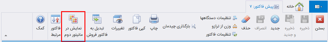 چنانچه از سیستمهای دو مانیتور استفاده میکنید و بخواهید اطلاعات وارد شده در فاکتور، در مانیتور دوم هم نمایش داده شوند، بر روی دکمه مانیتور دوم کلیک کنید.