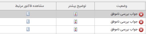 جواب بررسی ناموفق: در صورتی که با این پیغام رو به رو شدید، باید بدانید که فاکتور از نظر سامانه مورد ایراد قرار گرفته و دریافت نشده. برای مشاهده دلیل عدم موفقیت، می توانید روی دکمه توضیح بیشتر کلیک نمایید.